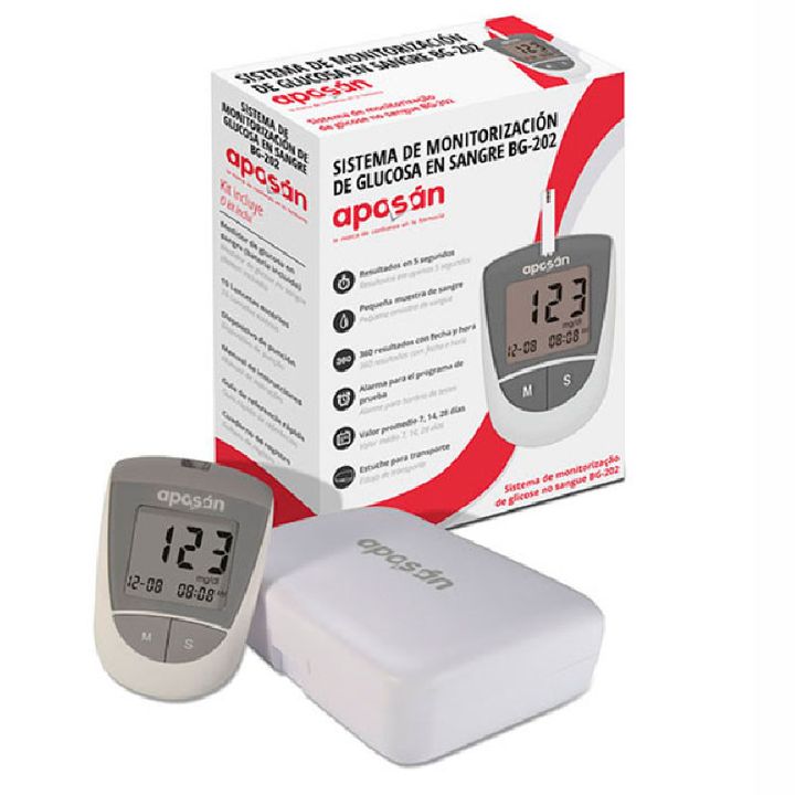 Aposán Glucómetro BG-202 es un medidor de glucosa diseñado para aquellas personas que necesitan monitorizar sus niveles de azúcar, facilitando los autoanálisis. El dispositivo permite almacenar 360 análisis y programar una alarma para avisar cuando se debe realizar la prueba. Aposán Glucómetro BG-202 ofrece resultados rápidos y fiables en tan solo 5 segundos. Aposán Glucómetro BG-202 incluye el dispositivo, lancetas, 10 tiras reactivas, dispositivo de punción con capuchón y manual de instrucciones de uso.